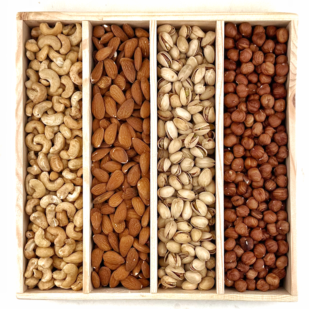 Wyborna mieszanka orzechów, skomponowana ze starannością i dbałością o jakość. W pięknej, ekologicznej, drewnianej skrzynce znajdziesz: